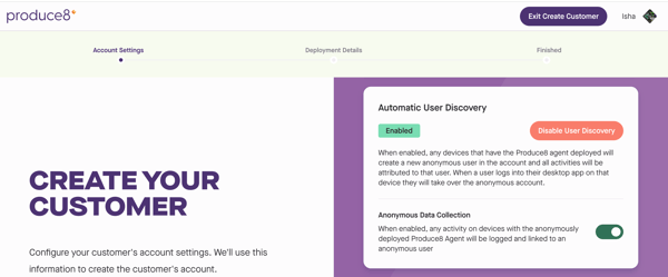 - When enabled, any device running the Produce8 Agent will automatically create an anonymous user profile in the account.