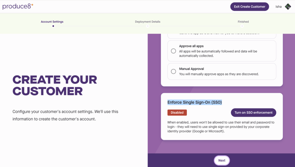 - When enabled, users must authenticate through Google or Microsoft to access Produce8.