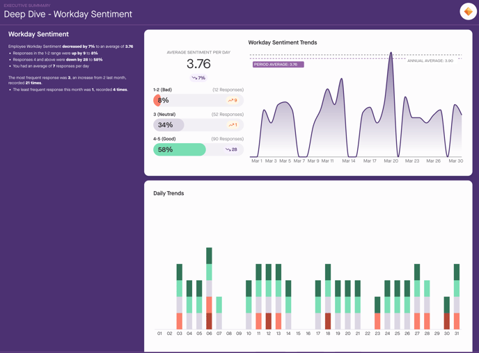 - Percentage of employees reporting positive sentiment (4-5)—indicating good workdays.