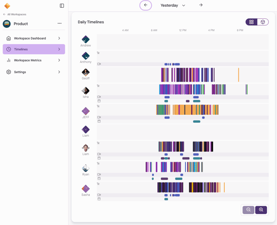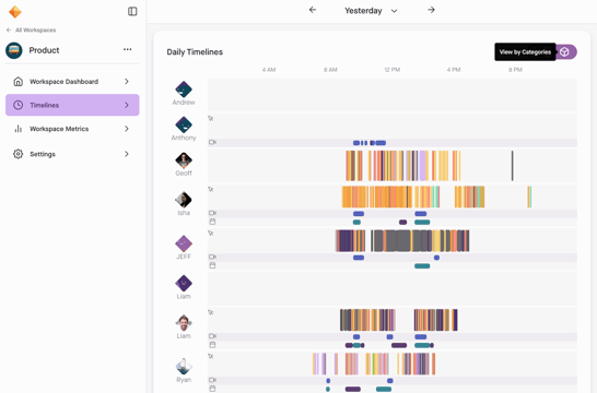 The Timeline & Activities page offers a visual breakdown of how the team interacts with work apps throughout the day.