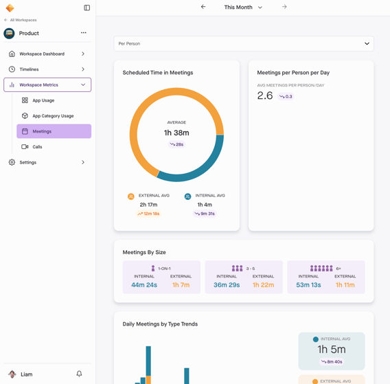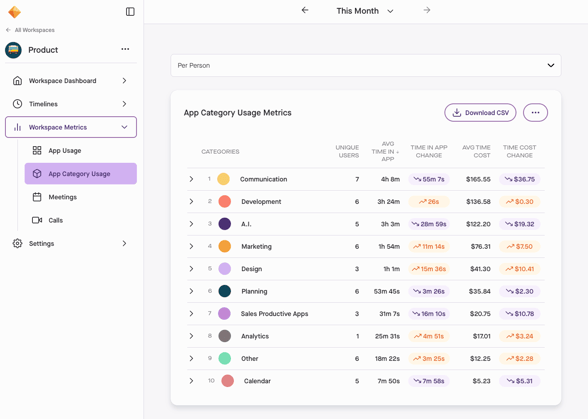 The Metrics page provides a data-driven view of how your team spends time across apps, calls, and meetings within the Shared Workspace.