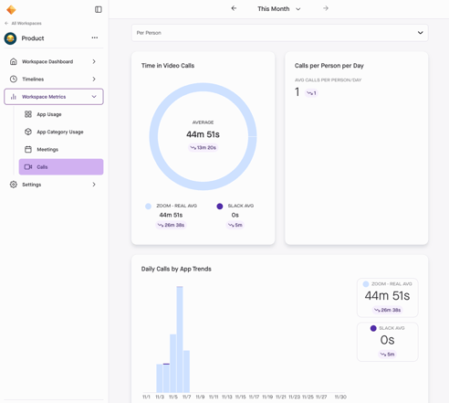 - Time in Calls – Total time spent in call-based interactions (e.g., Zoom, Slack, Microsoft Teams) during the selected period, with comparisons to the previous period.