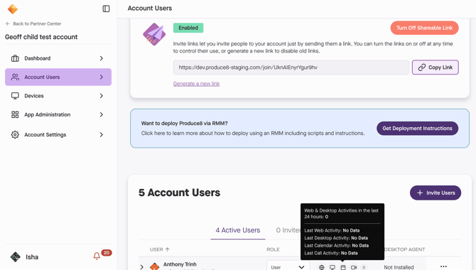 Produce8 partners can access customer accounts through the Partner Center, giving them visibility into deployment status, user setup, and account configuration without needing to rely on screenshots or manual confirmation.