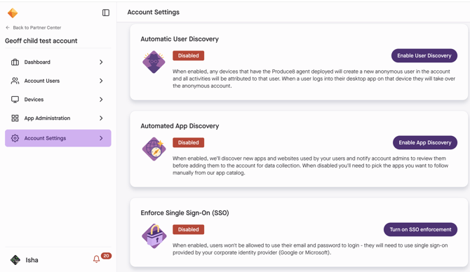 Manage account-level configuration, including company details, timezone, and settings related to user discovery and app discovery.