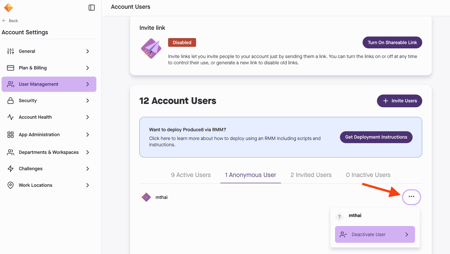 - For each duplicate, click the ellipsis (...) beside the anonymous users name and choose Deactivate User.